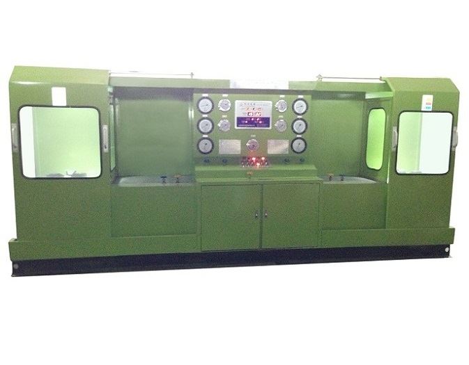 本機(jī)由液壓系統(tǒng)、機(jī)械部件,電器控制及多極氣源升壓裝置系統(tǒng)等部件組成。液壓系統(tǒng)是本試驗(yàn)臺(tái)的動(dòng)力主源。用于各類液壓缸和機(jī)械件驅(qū)動(dòng)執(zhí)行功能。試驗(yàn)面夾爪由液壓缸直接驅(qū)動(dòng)執(zhí)行,軸向夾緊壓力是按閥門試驗(yàn)壓力等級(jí)不同進(jìn)行調(diào)節(jié)增壓(最高液壓增壓壓力31 5MPa)。各夾爪受力均,夾緊可靠。徑向移動(dòng)由液壓缸傳動(dòng)執(zhí)行,各夾爪進(jìn)退同步,靈活自如,確保通徑大小不同閥門的測(cè)試。多極氣源升壓裝置是利用液氣聯(lián)動(dòng)增壓。增壓范圍0.6—32 0MPa,用于閥門介質(zhì)壓力試驗(yàn)。氣源升壓工作設(shè)有自動(dòng)和手控二種操作選擇,當(dāng)選用自動(dòng)升壓工作時(shí),工作人員可以近距離離開(kāi)操縱臺(tái)觀察現(xiàn)場(chǎng)試驗(yàn)情況。